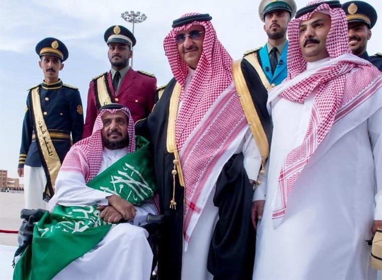 صورة تجمع ولي العهد الأمير محمد بن نايف بعد أن لبى طلب مواطن من ذوي الاحتياجات الخاصة بالتقاط صورة مع ابنه يوم تخرجه في الدورات التأهيلية بالأمن العام.