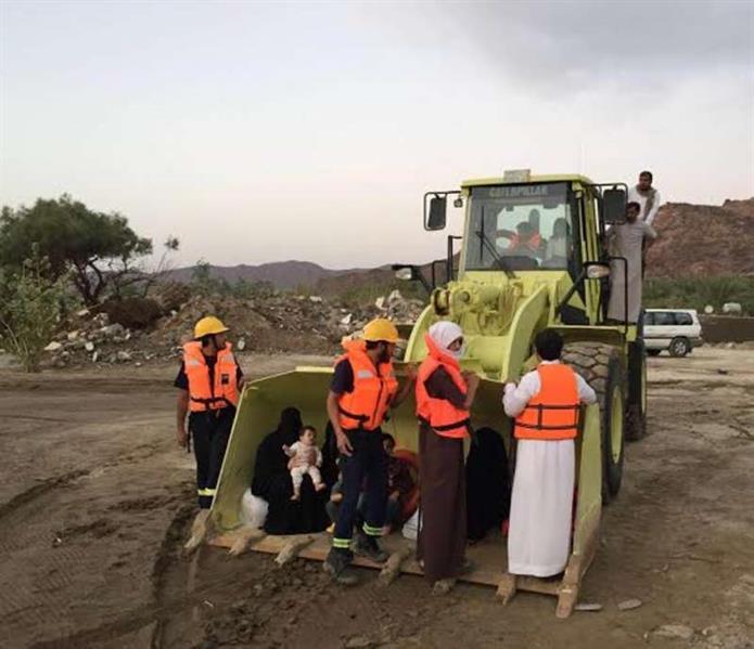 صورة رجال الدفاع المدني بمحافظة بيشة عند انقاذهم مواطنة حامل في الشهر الأخير، من إحدى القرى المعزولة بسبب السيول إلى ضفاف الوادي لنقلها إلى المستشفى، مستخدمين معدة "شيول".