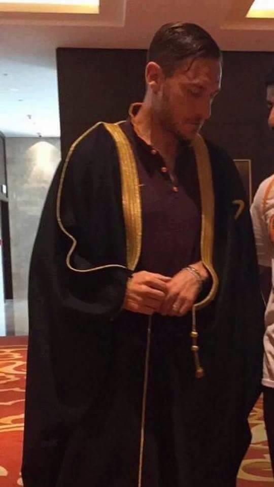 وظهر توتي في الصورة التي حظيت بتداول لأفت وهو يرتدي الزي الرسمي لروما ومن فوقه يرتدي عباءة على الطريقة العربية.