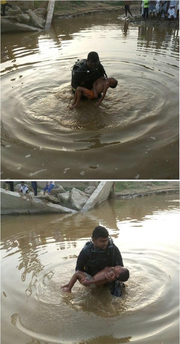 صورتان مؤلمتان للحظة انتشال غواصين من الدفاع المدني جثتي طفلين من بين 9 أطفال غرقوا في مياه راكدة تشكلت بفعل مياه الأمطار، وذلك بمحافظة جازان.