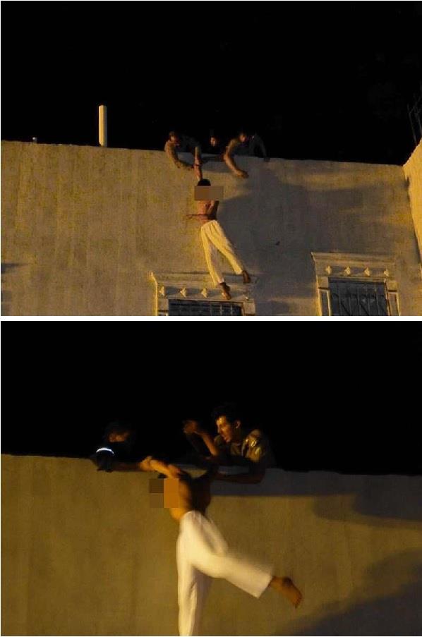 صورتان لرجال الدفاع المدني عند انقاذ شاب معتل نفسياً في اللحظات الأخيرة، حاول الانتحار برمي نفسه من الطابق الثالث من أعلى منزل، في عفيف.