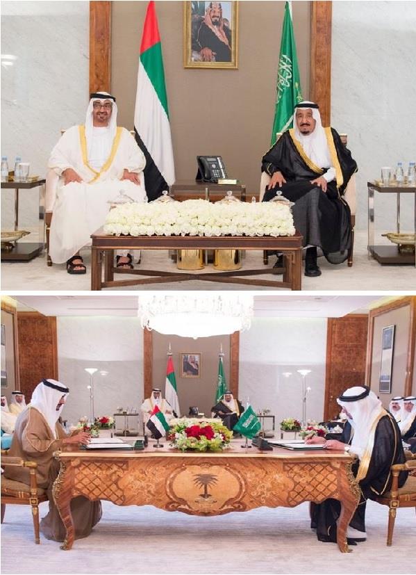 صور استقبال خادم الحرمين الشريفين الملك سلمان بن عبدالعزيز، للشيخ محمد بن زايد آل نهيان ولي عهد أبوظبي بقصر السلام، حيث شهدا توقيع الرياض وأبوظبي على محضر إنشاء مجلس التنسيق السعودي الإماراتي.
