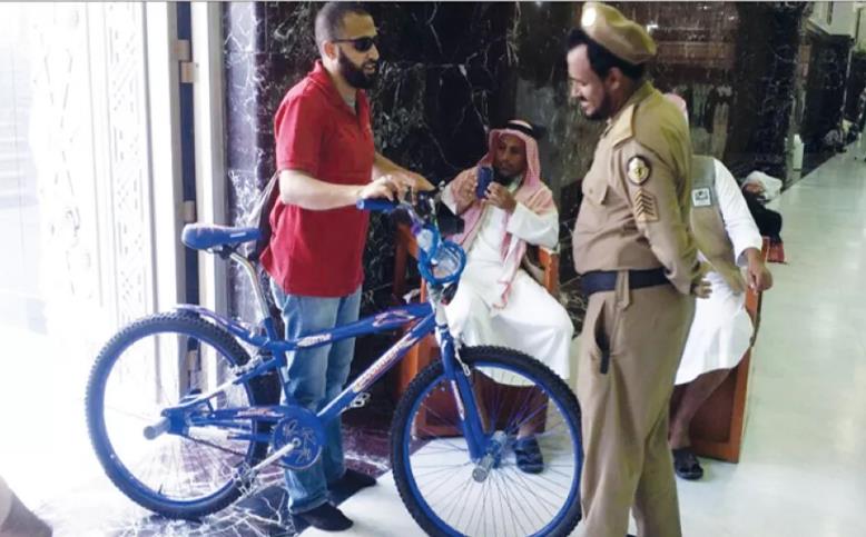 صورة شاب معه دراجة هوائية يحاول إدخالها للحرم المكي، خوفاً عليها من السرقة، وأحد رجال الأمن يمنعه من الدخول، موضحًا له أن ذلك مخالف للأنظمة.