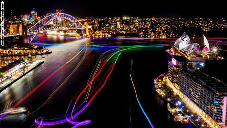 يتلألأ أفق مدينة سيدني الأسترالية بأضواء ملونة وصاخبة بمناسبة "مهرجان الضوء والموسيقى والأفكار،" والذي يعرض أعمالاً فنية وتماثيل مضاءة وموسيقى معاصرة، في العاصمة الأسترالية خلال العام الحالي.