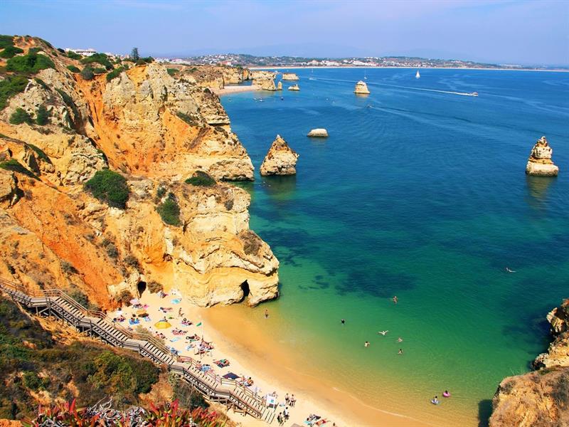 يُمكن الوصول إلى شاطئ برايا دو كاميلو في لاغوس في البرتغال عبر سلالم متعرجة، يوجد به العديد من المنحدرات والتكوينات الصخرية الرائعة التي تحيط بخليج منعزل، كما يُمكن الاستمتاع بطبق من المأكولات البحرية الطازجة في المطعم الذي يقع على منحدراته.