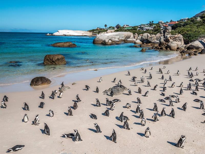 يُمكن لزوار شاطئ الصخور في مدينة كيب تاون في جنوب أفريقيا رؤية آلاف البطاريق الأفريقية المهددة بالانقراض تجوب الشاطئ.