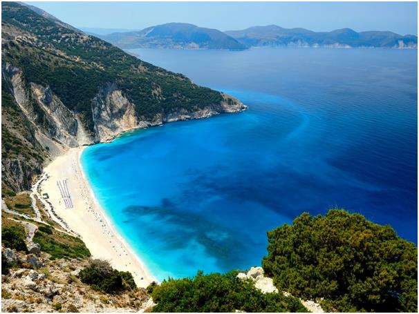 يقع شاطئ ميرتوس غربي كيفالونيا في اليونان، ويشتهر بألوان مياهه الساحرة.