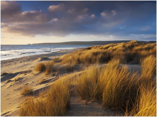 شاطئ خليج ستادلاند في دورست جنوب إنجلترا، ويتميز برماله الذهبية.