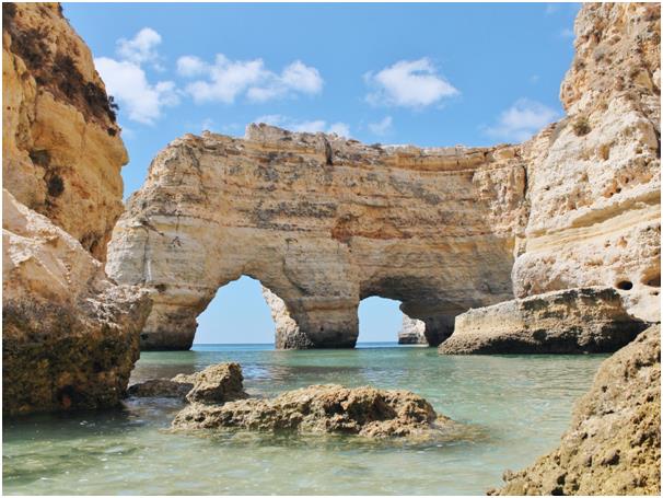 شاطئ رايا دا مارينا في منطقة الجرف البرتغالية، ويتميز بالرمال الذهبية والمنحدرات الصخرية.