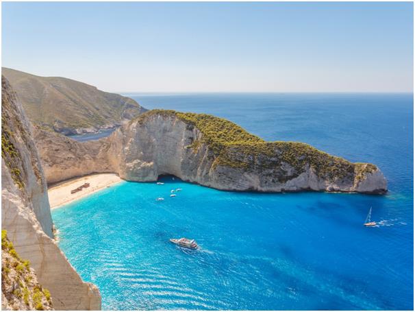 يتسم شاطئ نافاجيو في جزيرة زاكينثوس اليونانية برماله البيضاء ومياهه الزرقاء، وتحيط به منحدرات الحجر الجيري من جوانبه الثلاثة.