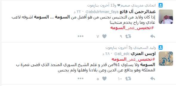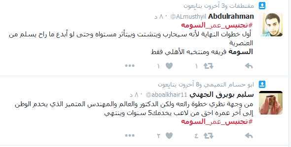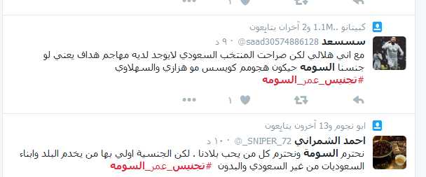 وتداوّل المغردون عبر موقع التواصل الاجتماعي “تويتر”، “هاشتاق” “تجنيس عمر السومة”؛ حيث انقسمت الآراء ما بين مؤيد ومعارض، حيث أكد الفريق الأول أن السومة سيكون مكسباً كبيراً للمنتخب السعودي، ممتدحين مستويات وأخلاقيات اللاعب التي ظهرت خلال الموسمين الماضيين، بينما اعتبر الفريق الثاني أن هناك شخصيات أخرى أولى بالحصول على الجنسية السعودية، وأن هناك ملفات أهم من إعطاء الجنسية للاعب كرة قدم.