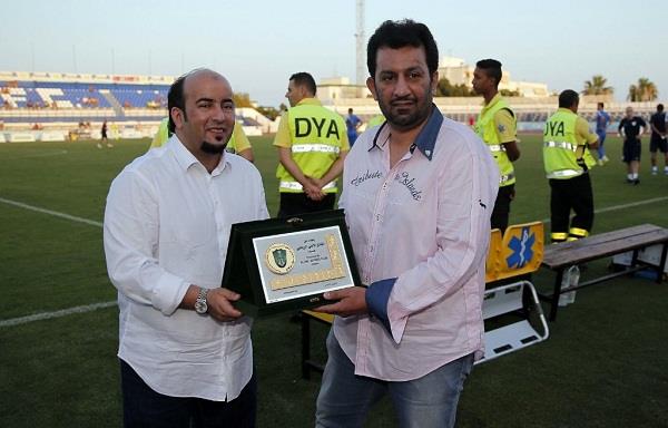 كرم رئيس مجلس ادارة النادي الاهلي مساعد الزويهري، الشيخ القطري عبدالله آل ثاني قبل بداية اللقاء الودي الذي جمع الفريقين الاهلي وملقا في إسبانيا في إطار استعدادات الملكي للموسم الرياضي المقبل ومباراة السوبر السعودي في لندن والتي تجمعه مع الهلال على ملعب نادي فولهام الانجليزي بعد عدة ايام .