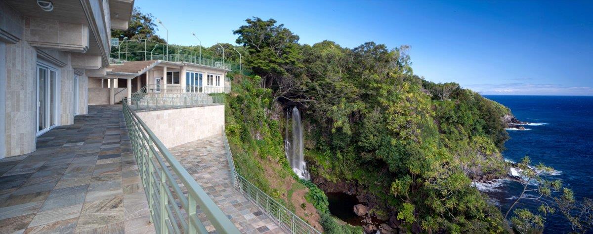 فناء القصر يطل على المحيط الهادئء وعدد من الشلالات ذات الطبيعة الخلابة.