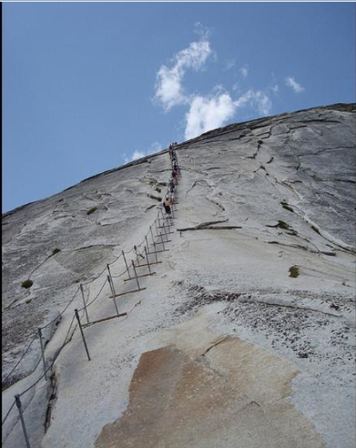 6- Half Dome: تعتبر قبة "هاف دوم" الجرانيتية أحد أبرز معالم متنزه "يوسيمينيتي" الوطني في ولاية "كاليفورنيا"، إذ تقع على ارتفاع 2700 متراً فوق سطح البحر، ويمثل الصعود إليها تحدياً كبيراً حتى لأمهر المتسلقين، وعلى الراغبين في ذلك إعداد أنفسهم مسبقاً لتحمل رحلة شاقة تصل إلى 29 كيلومتر من السير على الأقدام.