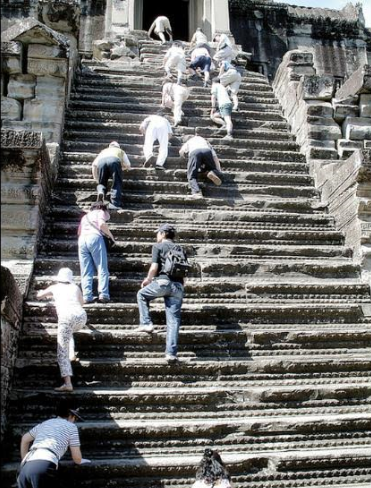 8- Angkor Wat: تعتبر حديقة "أنجكور" الأثرية من أبرز معالم "كمبوديا" وأهم مواقع التراث العالمي على قائمة "اليونسكو"، وهي تحتضن معبد "أنجكور" الذي يتمتع بموقع طبيعي خلاب، لكن الوصول إليه كان يحتاج لحرص ومجهود كبيرين حتى وقت قريب، فكان الزوار يضطرون للزحف على أيديهم وركبهم لتفادي الانزلاق خلال تسلق الدرج الشديد الانحدار، لكن الإدارة أضافت مؤخراً درجاً مريحاً يتكون من 47 درجة بعرض 1.2 متر لكل منها.