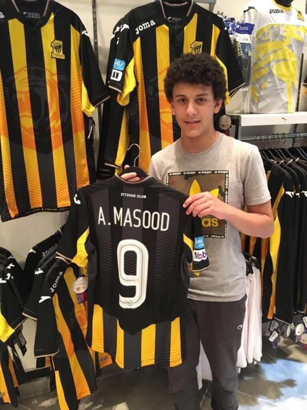 نشر حساب المركز العالمي للرياضة المسوق الرسمي لأطقم الأندية السعودي “GSC”، صورة لحفيد أحمد مسعود، عبر حسابه الخاص على موقع التدوينات القصيرة “تويتر”، وهو في متجر نادي الاتحاد، حاملًا قميصًا يحمل رقم 9، واسم جده.