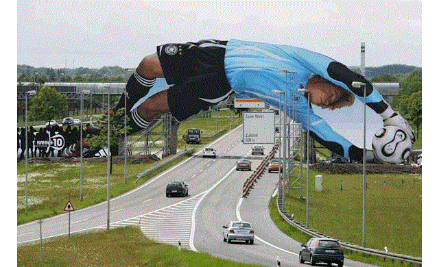 كما استخدمت العلامة التجارية الشهيرة "أديداس" صورة لحارس مرمى منتخب ألمانيا السابق "أوليفر كان" مرتديًا ملابس رياضية من نفس الماركة، أثناء محاولة له لصد أحد الكرات علي مرماه، علي واجهة جسر للمشاه.