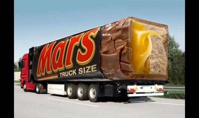 أحد إعلانات الشركة المنتجة للشيكولاتة الشهيرة "مارس"، تغطي حافلة ضخمة وكأنه حجم جديد للشيكولاتة الشهيرة.