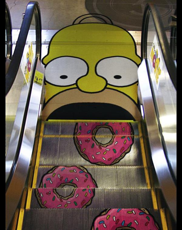 شركات إنتاج الأفلام لم تترك ذلك النوع من تسويق المنتجات، ففي الصورة يظهر أحد شخصيات فيلم كرتون عائلة "سمبسون" في أعلى درجة لأحد السلالم الإلكترونية، وهو يلتهم قطع الحلوى.