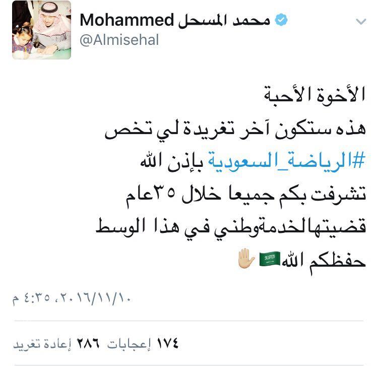 فاجأ أمين عام اللجنة الأولمبية والمشرف على المنتخبات سابقا محمد المسحل الجميع باعتزاله الوسط الرياضي من خلال تغريدة دونها في حسابه بموقع التواصل الاجتماعي "تويتر" قال فيها "الاخوة الاحبة .. هذه ستكون اخر تغريدة لي تخص الرياضة السعودية بإذن الله .. تشرفت بكم جميعا خلال 35 عاما قضيتها لخدمة وطني في هذا الوسط".