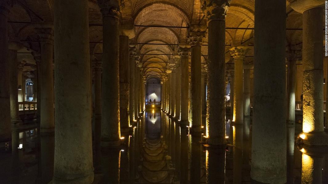 7- "Yerebatan bacilica Cistern" – تركيا: عبارة عن خزان للمياه بني في القرن السادس في الحقبة البيزنطية بمدينة إسطنبول، وأعيد اكتشافه في القرن السادس عشر.