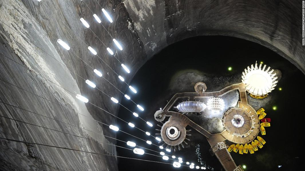 3- "Turda Salt mine" – رومانيا: يقع المنجم على بعد حوالي 450 كيلومترًا شمال غرب العاصمة "بوخارست" في مدينة "ترانسلفانيا"، وعرفت المنطقة بكونها مناجم تعدينية للملح منذ حقبة الرومان وجلبت ثروات لملوك رومانيا، وفي الحرب العالمية الثانية، استخدم كملجأ ضد الغارات الجوية ثم مخزن للجبن، والآن متنزه عام.