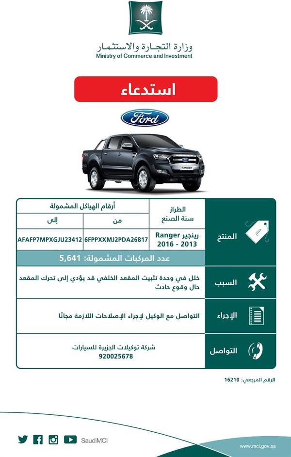 أعلنت وزارة التجارة والاستثمار اليوم الاثنين عن استدعاء 5641 مركبة من نوع "فورد رينجر" موديلات 2013 - 2016.