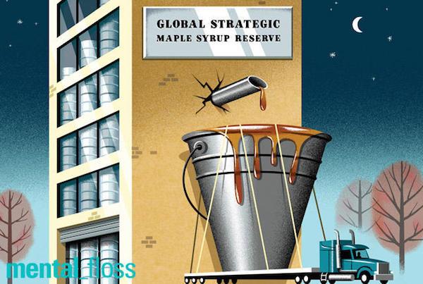 سرق الكمية الضخمة من مركز الاحتياطي الاستراتيجي العالمي لشراب القيقب الخاضع لإدارة اتحاد منتجي شراب القيقب في إقليم كيبيك الكندي.