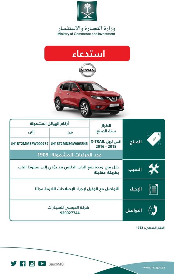 أعلنت وزارة التجارة والاستثمار اليوم الخميس عن استدعاء 1909 مركبات من نوع نيسان إكس تريل موديلات 2015 - 2016، لخلل في وحدة رفع الباب الخلفي.