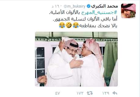 ونشر البكيري صورة عبر حسابه الشخصي على موقع “تويتر”، أظهرت جستنية وهو يقوم بتقبيل رأس منصور البلوي، وعلق عليها بقوله: “جستنية المهرج بالألوان الأصلية، أما باقي الألوان لتسلية الجمهور، يالا نضحك بمقاطعه”، واضعًا مع التغريدة “هاشتاق” جاء بعنوان “جستنية المهرج”.