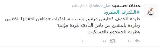 من جانبه، رد جستنية على تغريدة البكيري من خلال تغريدة أخرى، قال فيها: “البكيري المطرود، طرده اللامي كحارس مرمى بسبب سلوكيات خوفًا من انتقالها للاعبين، وطرده باعشن من باص النادي طردة مؤلمة، وطرده الجمجوم بالعسكري”، مرفقًا مع التغريدة “هاشتاق” بعنوان “البكيري المطرود”.