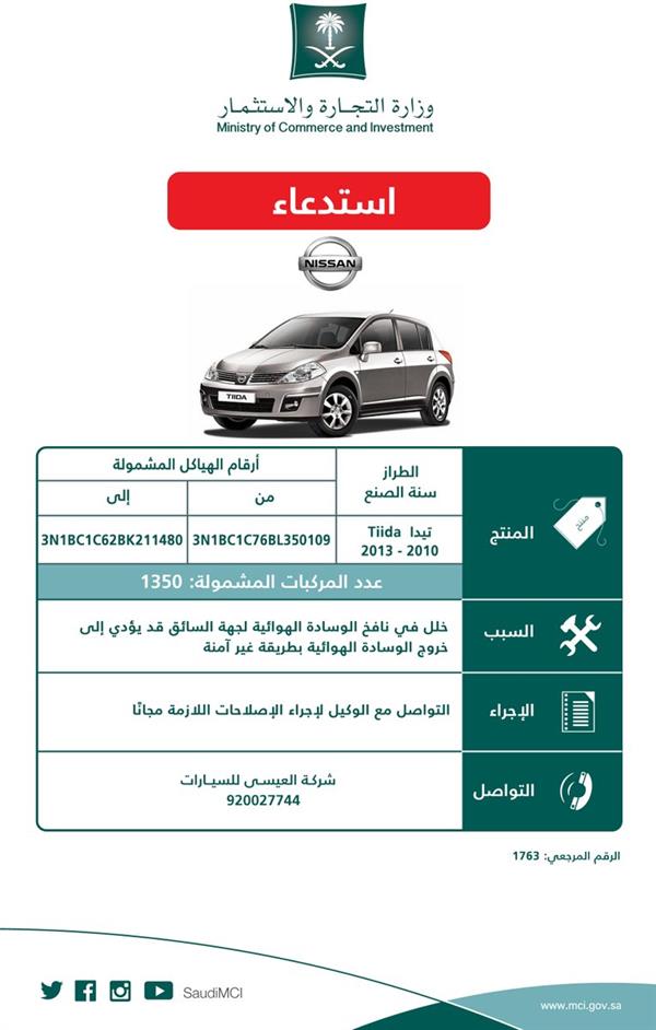 أعلنت وزارة التجارة والاستثمار اليوم الاثنين عن استدعاء 1350 سيارة نيسان - تيدا موديل 2010 - 2013 بسبب خلل في نافخ الوسادة الهوائية.