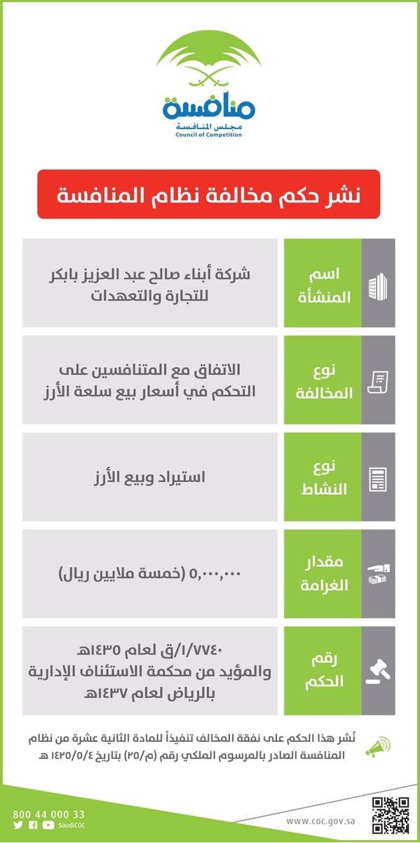 أصدر مجلس المنافسة حكمًا ضد شركة "أبناء صالح عبدالعزيز بابكر للتجارة والتعهدات"، لارتكابها مخالفة لنظام المنافسة في بيع الأرز، وتضمن الحكم على الشركة الغرامة المالية والتشهير.