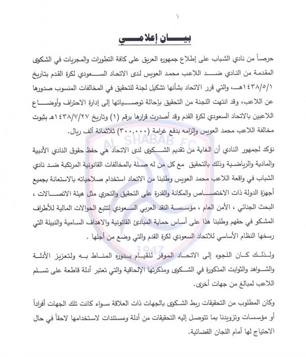 أصدر مجلس إدارة نادي الشباب بياناً إعلامياً حول شكواه ضد اللاعب محمد العويس، والنتائج التي خلصت إليها لجنة التحقيق المشكّلة من قبل الاتحاد السعودي لكرة القدم.