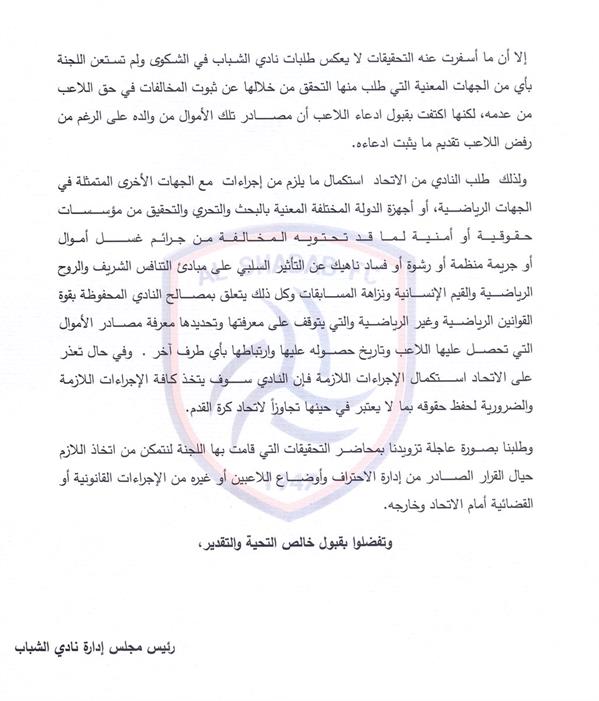 وقال مجلس إدارة النادي إن ما أسفرت عنه التحقيقات حول الشكوى لا يعكس الطلبات التي تقدم بها النادي، مبيناً أن اللجنة لم تستعِن بالجهات التي طُلب منها التحقق من خلالها عن ثبوت المخالفات في حق اللاعب من عدمه.