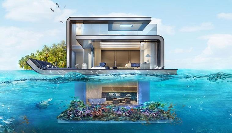 كما تتضمن كل فيلا تتكون من ثلاثة طوابق، طابقاً مغموراً بأكمله تحت سطح البحر، مزود بنافذتين كبيرتين، يبلغ حجم كل واحدة منهما 25 متراً مربعاً، لتعرضان مشاهد خلابة للحياة البحرية عن قرب.