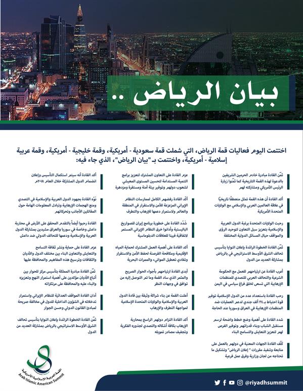 وفيما يلي كافة بنود إعلان الرياض (بيان قمة قادة الدول العربية والإسلامية والولايات المتحدة الأمريكية):