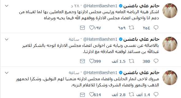 وقال باعشن في تغريدات عبر حسابه الشخصي على موقع “تويتر”: “مبروك لأخي أنمار الحايلي وأعضاء مجلس إدارته”، متمنيًا لهم التوفيق. وأضاف “شكرا لجمهور الذهب والنمور وأعضاء الشرف وشكرًا للإعلام النزيه”.