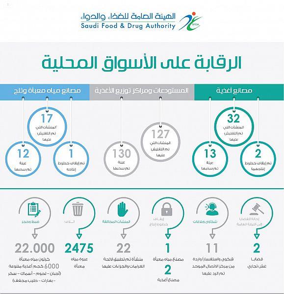 كشفت الهيئة العامة للغذاء والدواء عن تفاصيل حملتها للرقابة على الأسواق خلال إجازة عيد الفطر في مدن المملكة كافة، والتي شملت التفتيش على مصانع للأغذية والمياه إضافة إلى عدد كبير من المستودعات الغذائية.