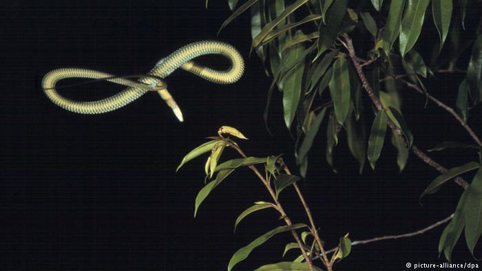أفعى "كريسوبيليا" يمكنها القفز والتحليق في الهواء ولذلك يطلق عليها تسمية "الأفعى الطائرة". ويمكنها التحليق لمسافة 30 مترا. وتقتات على القوارض والسحالي والطيور، بما فيها الخفافيش. ولا تشكل أي خطرا على البشر. الكاتب: بريغيته أوستيرات، صوفيا فاغنر/ زمن البدري