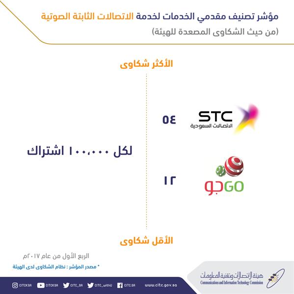 كشفت هيئة الاتصالات وتقنية المعلومات اليوم (السبت)، عن مؤشر تصنيف مقدمي خدمات الاتصالات من حيث عدد الشكاوى المقدمة ضدها للهيئة من المشتركين، عبر نظامها الإلكتروني، خلال الربع الأول من العام الحالي 2017.