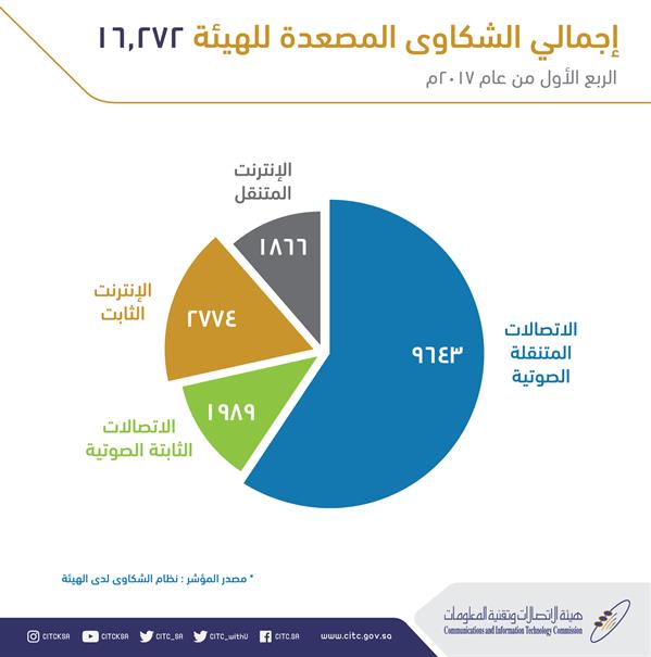 وأوضحت الهيئة أن إجمالي عدد الشكاوى وصل إلى 16272 منها 9643 شكوى خاصة بخدمات الهاتف المتنقل، و1866 شكوى من الانترنت المتنقل، و2774 شكوى من الانترنت الثابت، فيما بلغ عدد الشكاوى من الهاتف الثابت 1989.