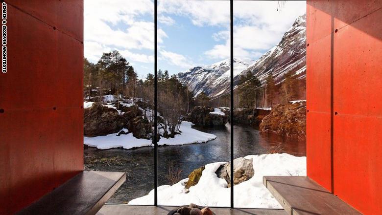 صممت هذه الساونا في النرويج بطريقة غير تقليدية وعصرية بعض الشيء، إذ طليت جدرانها باللون الأحمر الفاقع، وتتميز بنوافذ زجاجية تمتد من السقف إلى الأرض وتطل على نهر فالدولا.