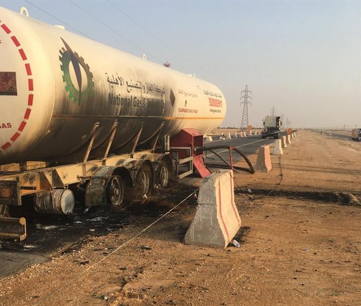 وأوضح الدفاع المدني أنه تلقى بلاغًا ظهر اليوم يفيد باندلاع حريق في ناقلة غاز بالطريق العام على مسافة 15 كيلومترا جنوبي حوطة بني تميم، حيث تدخلت الفرق سريعًا للحيلولة دون انتشار الحريق في باقي الناقلة الممتلئة بالغاز.