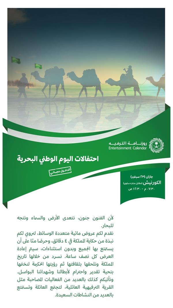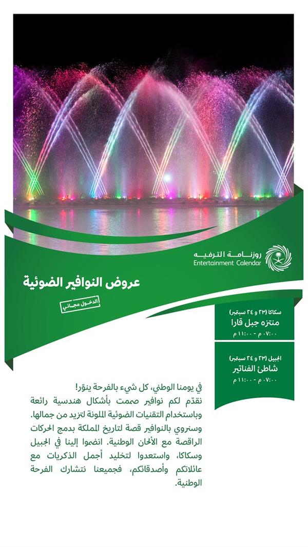 من فعاليات هيئة الترفيه باليوم الوطني، عروض النوافير الضوئية المائية، يومي 23 و 24 سبتمبر، ويتوقع لها 40 ألف مشاهدة في "سكاكا والجبيل"، بقوة دفع تصل لـ 22 متر للأعلى و40 متر للأمام، مع الكثير من الإضاءة الملونة، كما سيتم دمجها مع الموسيقى، بحيث تكون مخصصة لليوم الوطني، وكأنها تحكي قصة قصيرة عن تاريخ المملكة على الماء.