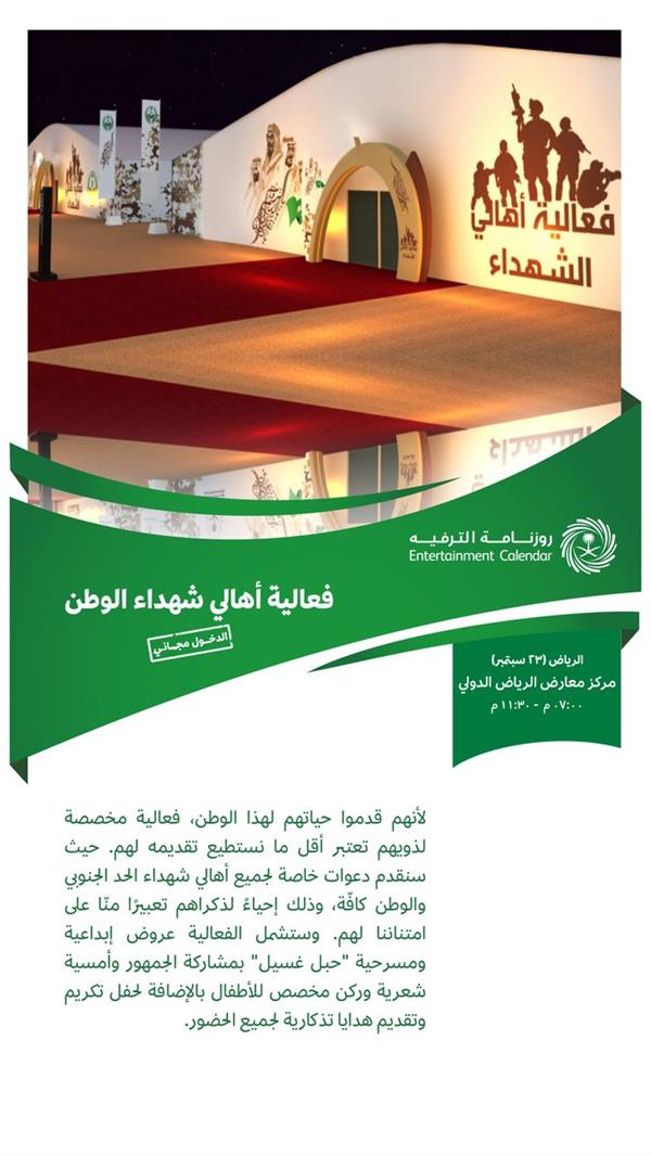 وخصصت الهيئة العامة للترفيه، فعالية خاصة لأهالي الشهداء من جنودنا البواسل، امتناناً للتضحيات التي قدموها للذود عن حياض الوطن، من خلال فعالية "أهالي شهداء الوطن"، والمقرر إقامتها في مركز الرياض الدولي للمعارض والمؤتمرات في 23 سبتمبر، وتشمل عروضا إبداعية، ومسرحية حبل غسيل، وركنا للأطفال، وحفل تكريم وهدايا تذكارية.