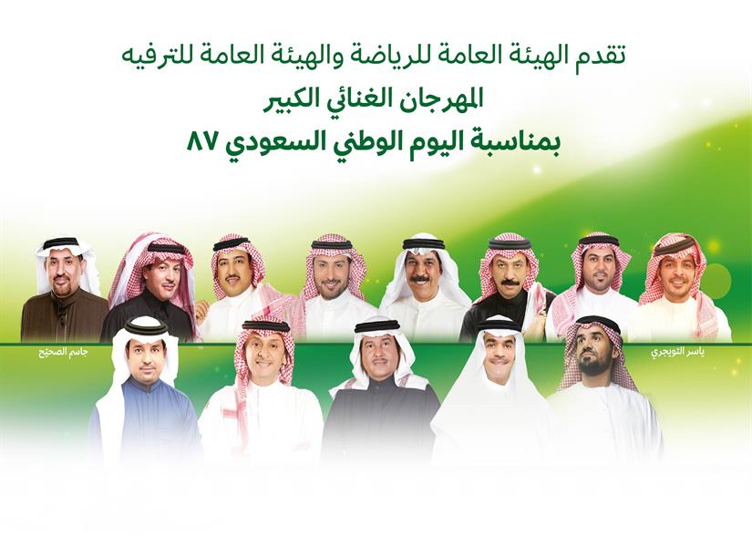 وتقيم الهيئة العامة للترفيه في 23 سبتمبر المهرجان الغنائي الكبير بالصالة المغطاة بملعب الجوهرة، وهو حفل غنائي سيحيه أكبر تجمع للفنانين الخليجيين وعددهم 11 فنان من نجوم الفن السعودي والخليجي بمناسبة اليوم الوطني، وهم فنان العرب محمد عبده، وماجد المهندس، وأصيل أبو بكر، وعبد المجيد عبدالله، وطلال سلامة، وعبادي الجوهر، والفنان الإماراتي حسين الجسمي، والكويتي عبدالله الرويشد.