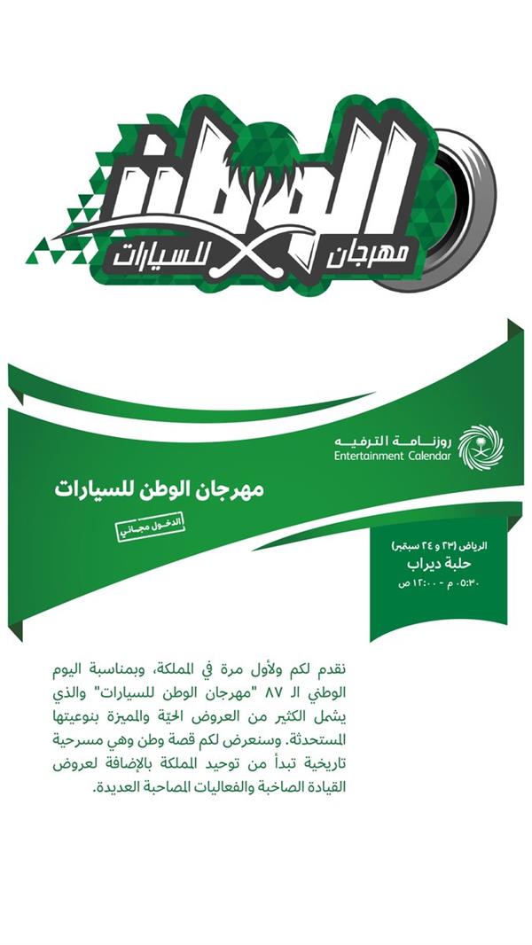 ومن الفعاليات الرياضية مهرجان "الوطن للسيارات"، بطابع رياضة الدرفت، مع عروض ترفيهية متنوعة، كمسرحية "قصة وطن"، سرد تاريخي من التوحيد حتى رؤية 2030، وعروض ألعاب محاكاة القيادة، ومسابقة أجمل تصميم وطني للسيارات، وعروض أندية السيارات الكلاسيكية، في حلبة "ديراب" بالرياض، يومي 23 و 24 سبتمبر.