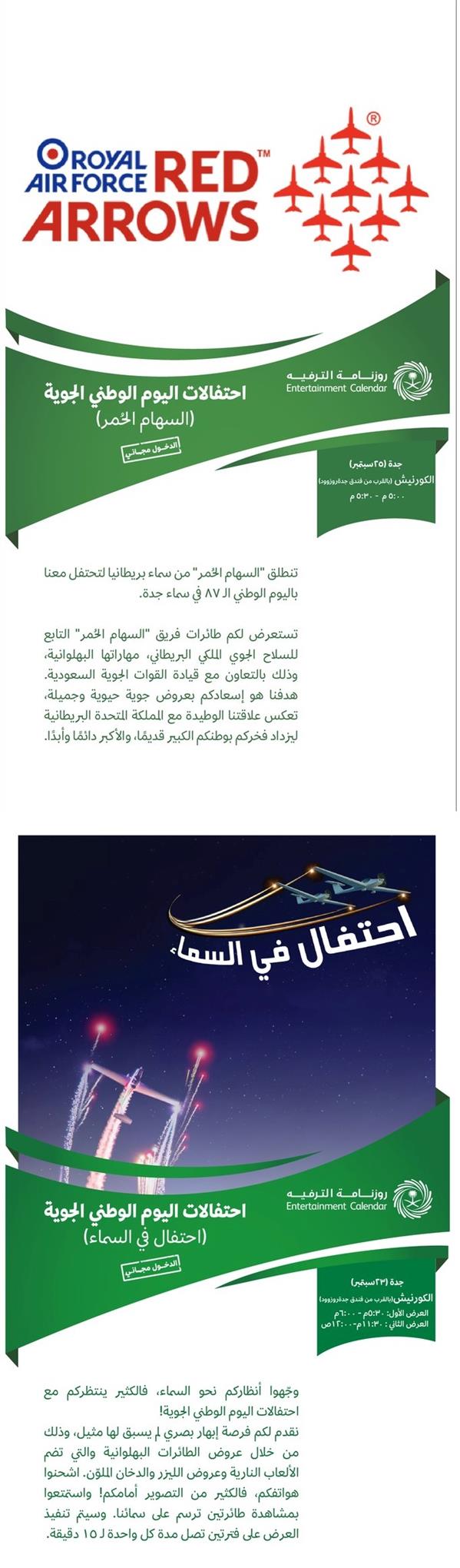 وستضيف الطائرات البهلوانية نكهة خاصة على احتفالات اليوم الوطني الجوية في سماء جدة في 23 سبتمبر، يتخللها عرضان، يتمثل الأول بعروض بهلوانية على ارتفاع 2000 قدم سيستخدم فيها الدخانان الأبيض والأخضر، ورسم لوحة جمالية على شكل قلب ستدهش جميع من سيشاهدها، العرض الثاني فيتمثل بالعروض البهلوانية، واستخدام ألعاب نارية متخصصة على ارتفاع 2000 قدم، والتي تعتبر من أكثر الفعاليات التي تفضلها الجماهير في الاحتفالات الوطنية على مستوى العالم.