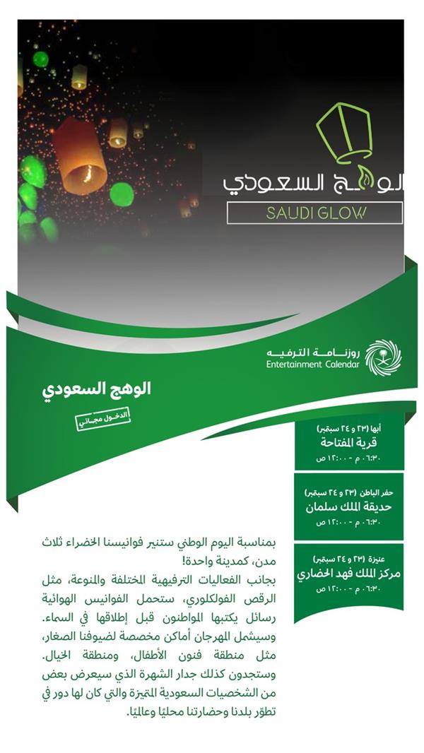 في مهرجان الوهج السعودي (ترفيهي تفاعلي) تطلق الفوانيس الورقية الهوائية الخضراء في 3 مدن بنفس الوقت بـ "أبها، وحفر الباطن، وعنيزة"، وتحتوي على بطاقات لاصقة يكتب عليها 2000 مواطن رسالة أمل، مع عروض من الرقص الفولكلوري، ومنطقة للفنون والحرف اليدوية، وأخرى لفنون الأطفال، وجدار الشهرة لشخصيات وطنية ساهمت في نهضة وتنمية المملكة. ويقام المهرجان يومي 23 و24 سبتمبر.